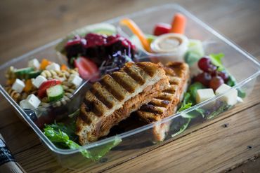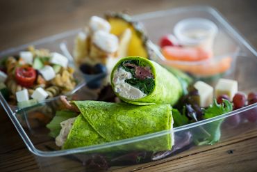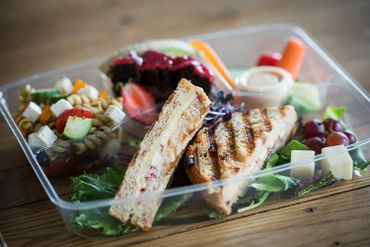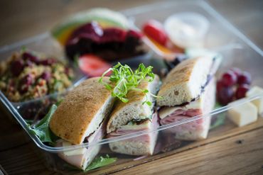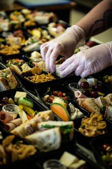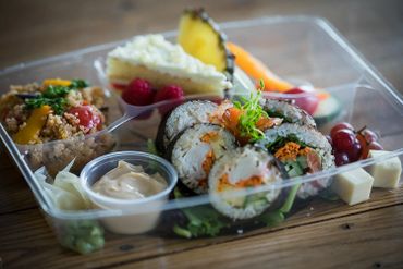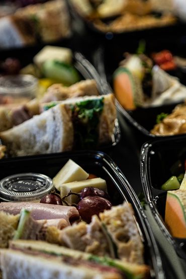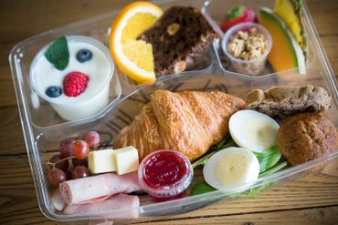 Tous les boîtes inclus un délicieux dessert et fruits. Les boites inclus crudités trempette fromage raisins. Inclus les ustensiles.